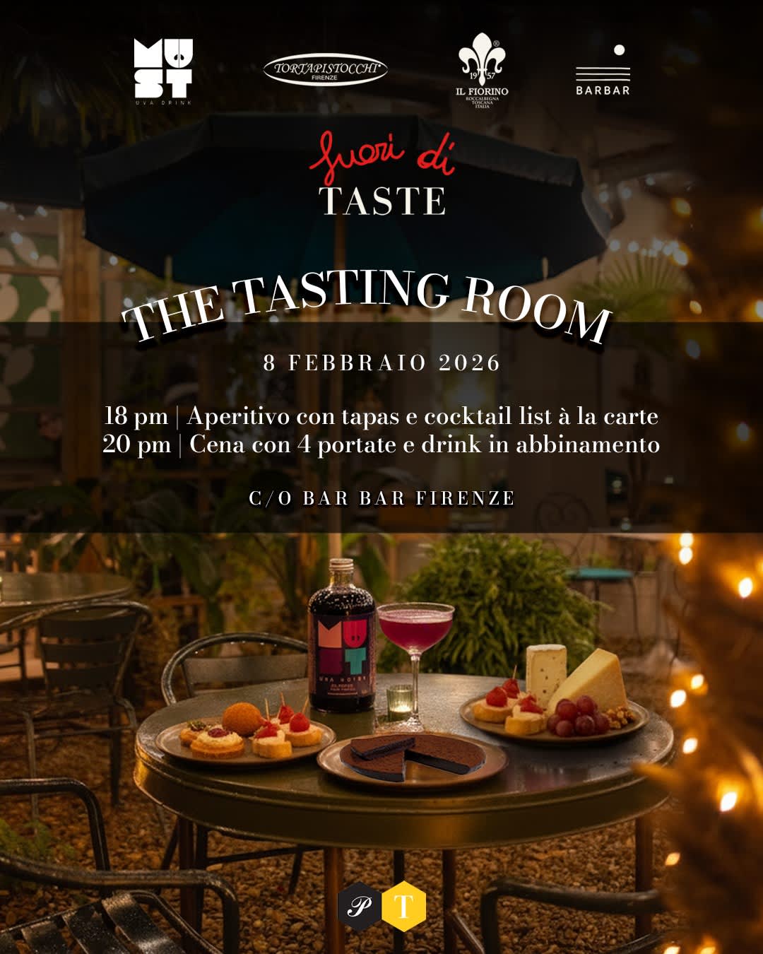 Enjoy a tasteful evening at Bar Bar Firenze with Must Uva Drink, Caseificio Il Fiorino and Pistocchi. Choose a tasty aperitivo with tapas and à la carte drinks or a themed 4 course dinner served with a paired cocktails for €40. A unique chance to taste iconic flavors and experience the true Pitti vibe.