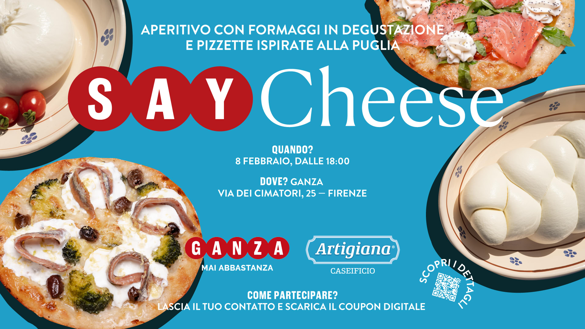 Artigiana & Ganza sign the aperitivo time: cheeses from Puglia meet freshly baked pizzette in Florence. Easy bites, authentic flavour, convivial vibes. Glasses clink, smiles flow, and everyone says cheeeeese.